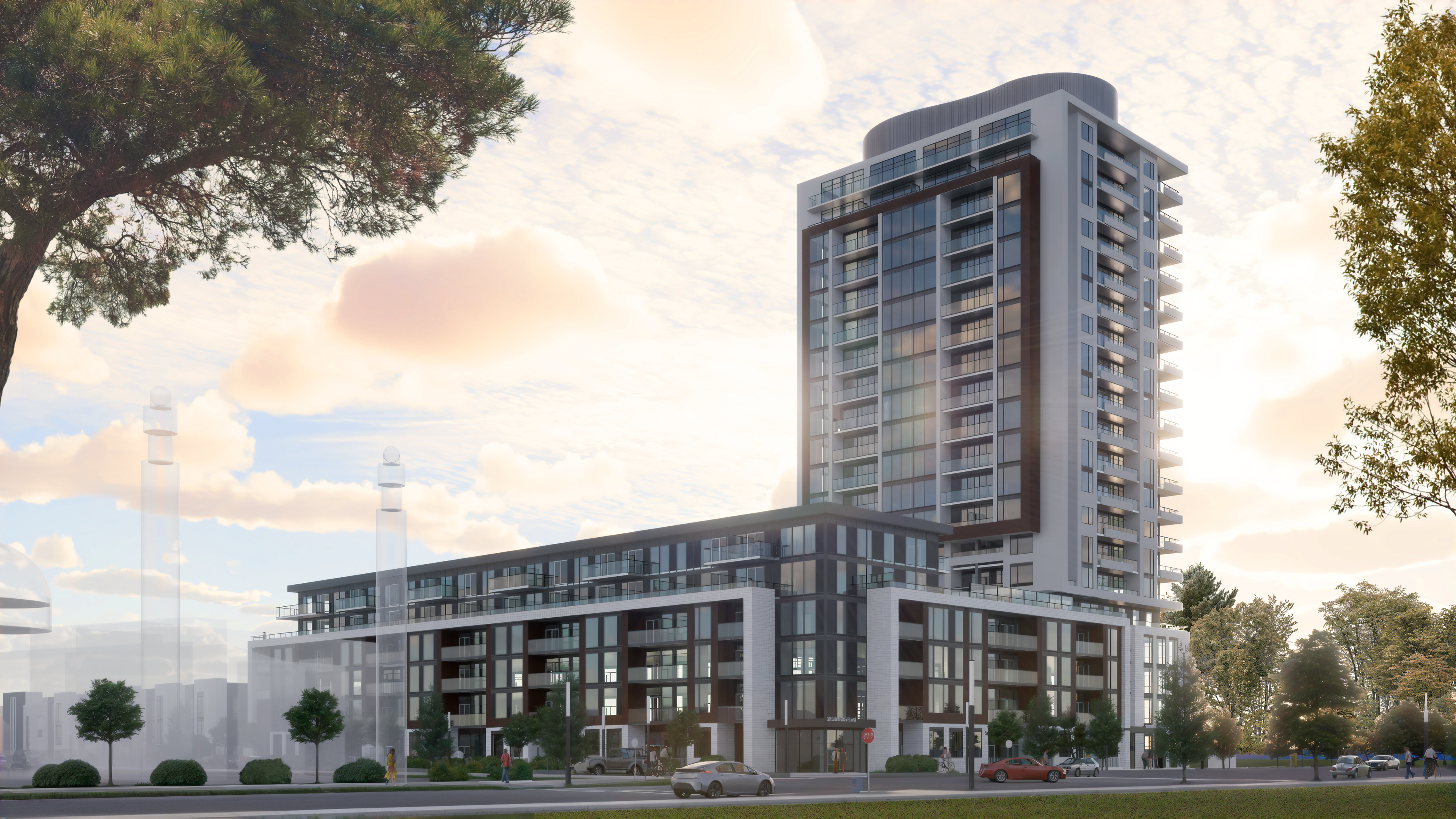 The community is anchored by a 20-storey high-rise tower along Brock Road, seamlessly connected to a 6-storey mid-rise block on Usman Road via a 4-storey podium. Together, these structures provide 372 residential units in a variety of layouts. To ensure a harmonious integration with the surrounding neighborhood, the site also includes 34 stacked townhouses and 10 street townhouses, creating a natural transition between the new development, existing low-rise homes, and the ravine.